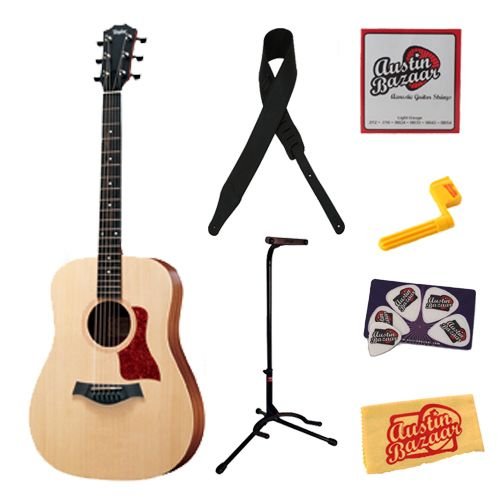 Bundle includes Taylor BBT Big Baby Taylor Dreadnought Acoustic Guitar, Stand, Leather Strap, Strings, String Winder, Pick Card, and Polishing Cloth.